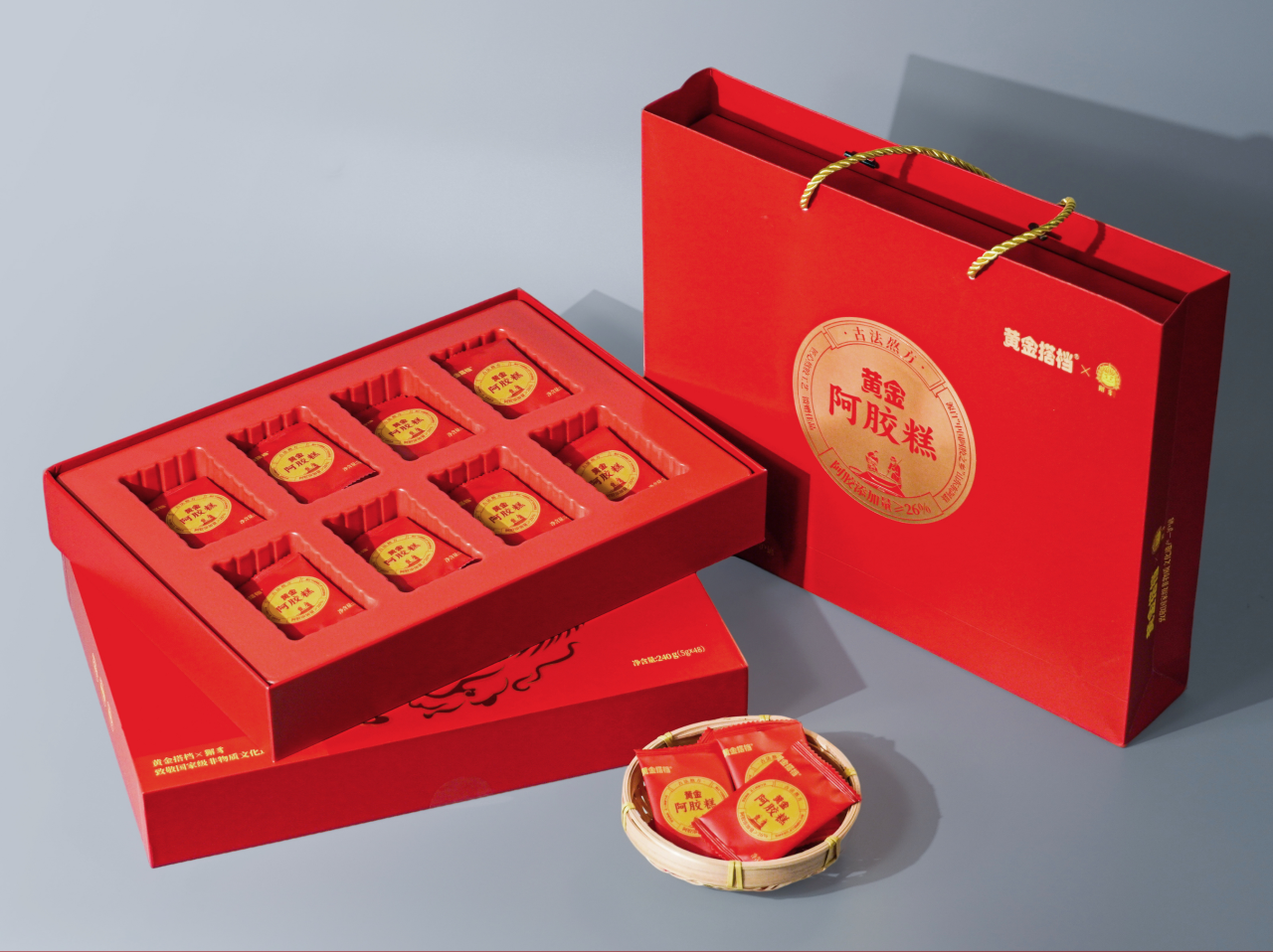 联名款黄金搭档阿胶糕,延续科学配比与真材实料,以阿胶(添加量≥26%)、核桃、黑芝麻等为原料精心熬制而成,醇香软糯、营养滋补。